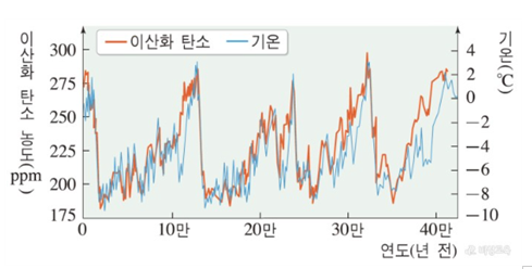 * 빙하 코어를 연구하여 알아낸 과거 약 42만 년 동안의 이산화 탄소 농도와 기온 변화