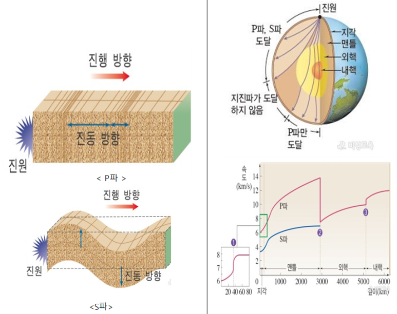 지진파는 P파와 S파가 있다. P파가 S파보다 속도가 빨라서 P파가 가장 먼저 도착하여 기록되고, S파가 두 번째로 기록되며, 진폭이 클수록 지진의 피해가 크다.