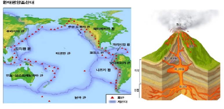 2) 화산활동이 활발히 일어나는 지역은 판의 경계와 일치하며, 환태평양조산대라 칭한다.
