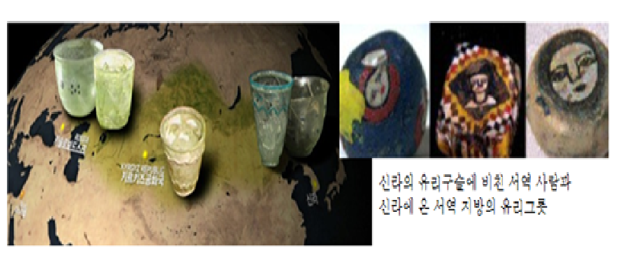 | 내물 마립간과 눌지 마립간이 신라를 다스리던 때에, 바다 건너 침입해 온 왜를 몰아내기 위해 고구려 군대의 도움을 받은 일이 있었다. 이 일을 계기로 신라는 고구려의 간섭을 받기 시작했는데, 이 때 고구려와의 교류도 많아졌다. 그리하여 고구려에 가거나 고구려를 거쳐 중국까지 가서 서역의 물건을 들여오고, 로마의 물건을 접할 기회까지 생겼다고 학자들은 추측한다. 또한 이 때, 로마에서 만든 유리 역시 들여왔을 것이라 짐작하낟. 당시 신라인들도 유리를 만들 줄 알았다. 하지만 로마에서 온 유리그릇은 훨씬 화려하고 이국적이서 귀한 물건으로 여겨졌다. 그래서 왕족, 귀족들은 로마의 유리를 가졌다는 것에 큰 자부심을 가지고, 무덤에도 넣었던 것으로 예측한다. |